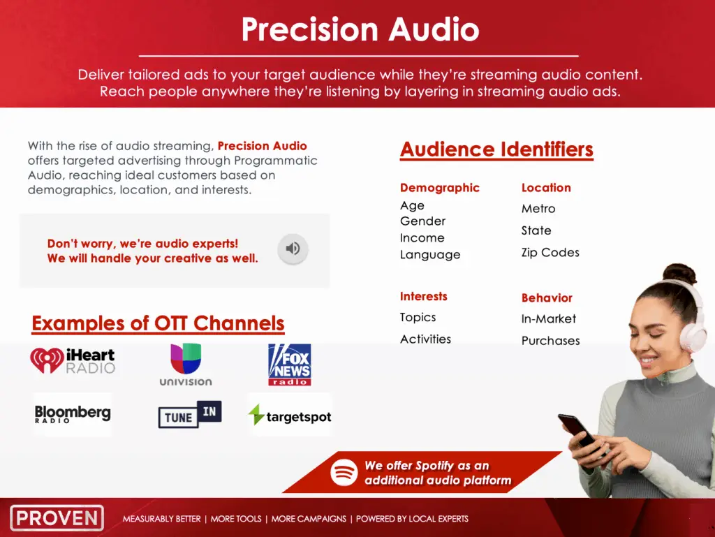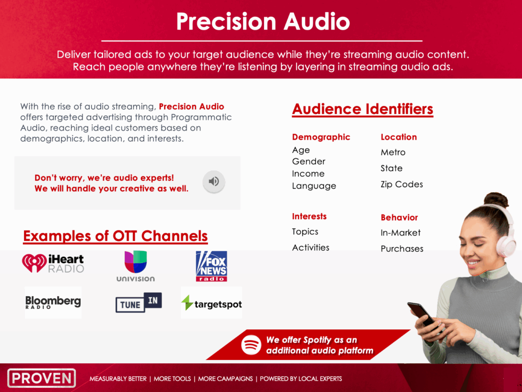 Listeners can’t scroll past an audio ad—completion rates are some of the highest in digital, and Proven turns that attention into conversions.